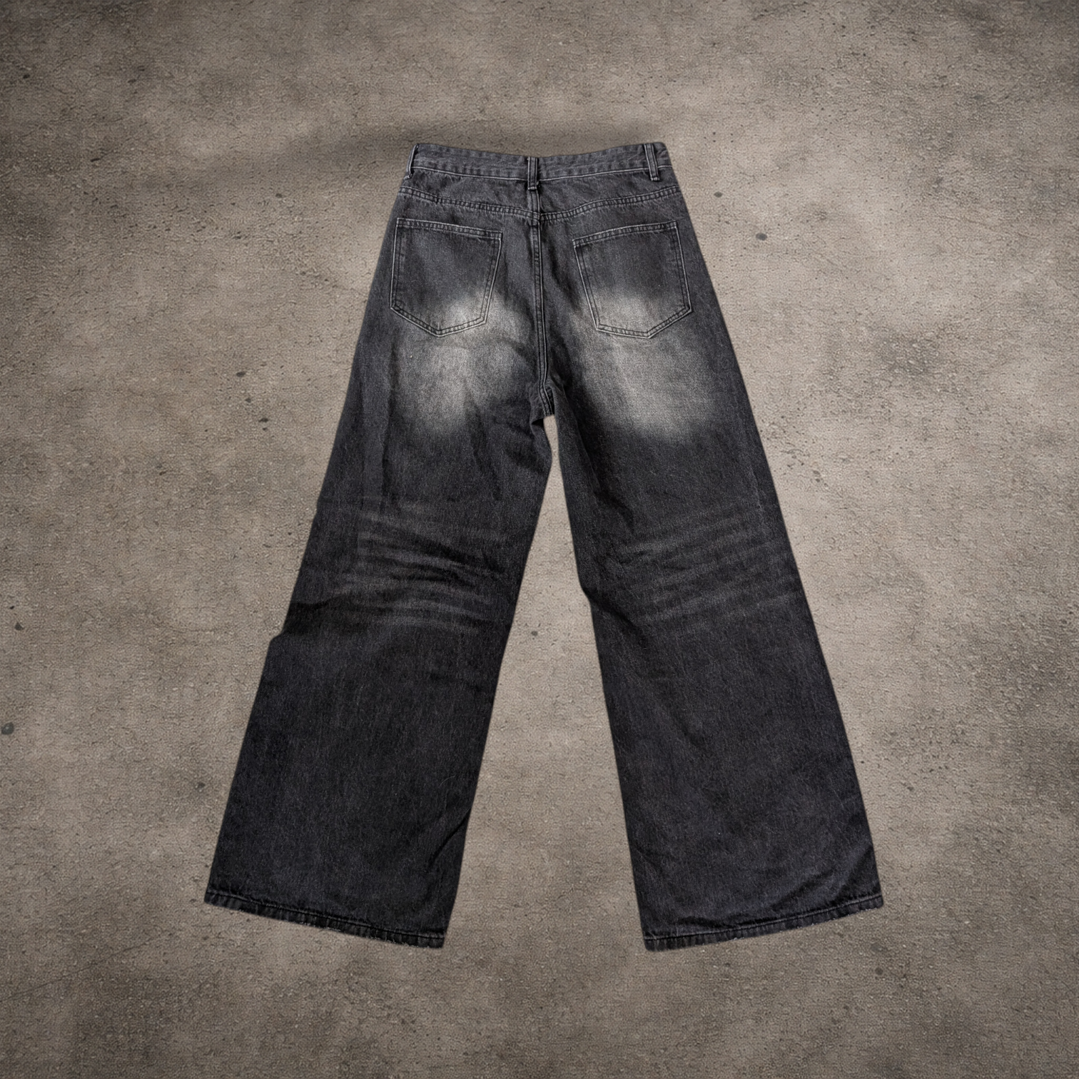 Road Rash Black 001 is the aftermath. This pair is built on a washed black base with subtle fading that mimics wear from impact and friction. The reconstruction line cuts sharply across the leg, secured with dense stitch work that evokes emergency repair and restraint. Its washed black finish gives the denim depth, shifting between charcoal and jet depending on the light. Paired with exposed stitching, perfect baggyness, and a metal key clip, Road Rash Black feels raw, heavy, and uncompromising.